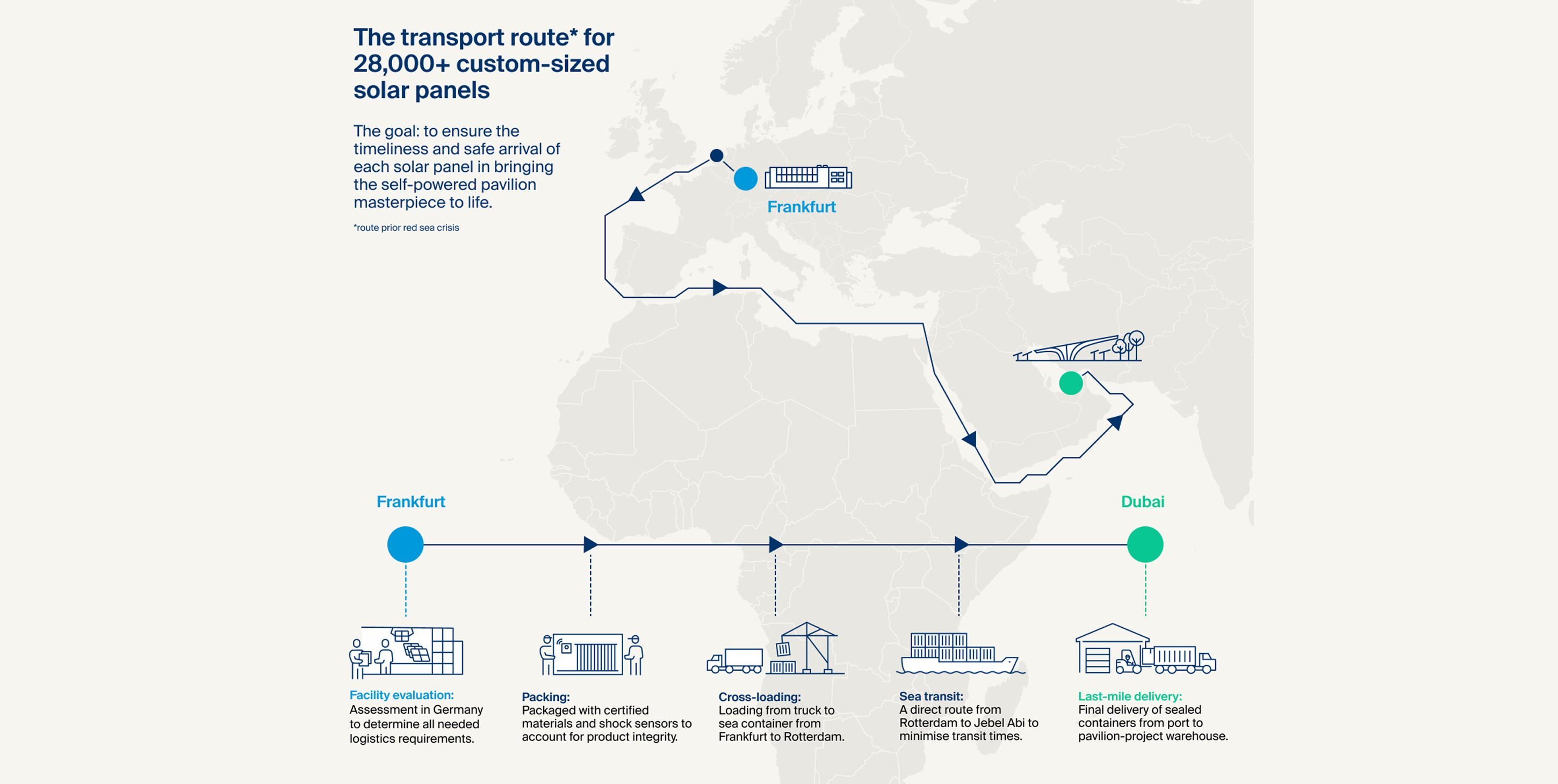 Route options: the ideal route considered timeliness, security and the needed capabilities of our logistics network, moving the panels from Frankfurt to Rotterdam and from Jebel Ali to the pavilion site.